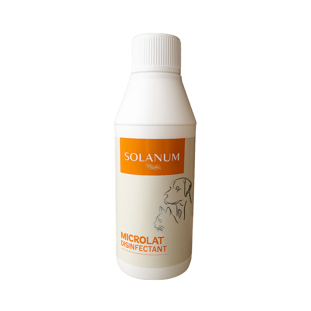 Solanum Microlat Disinfectant indeholder en gruppe naturlige essentielle olier (Microlat), der medvirker til at bekæmper bakterier. Produktet er miljøvenligt, og kan benyttes både direkte på dyr, og i deres omgivelser.
