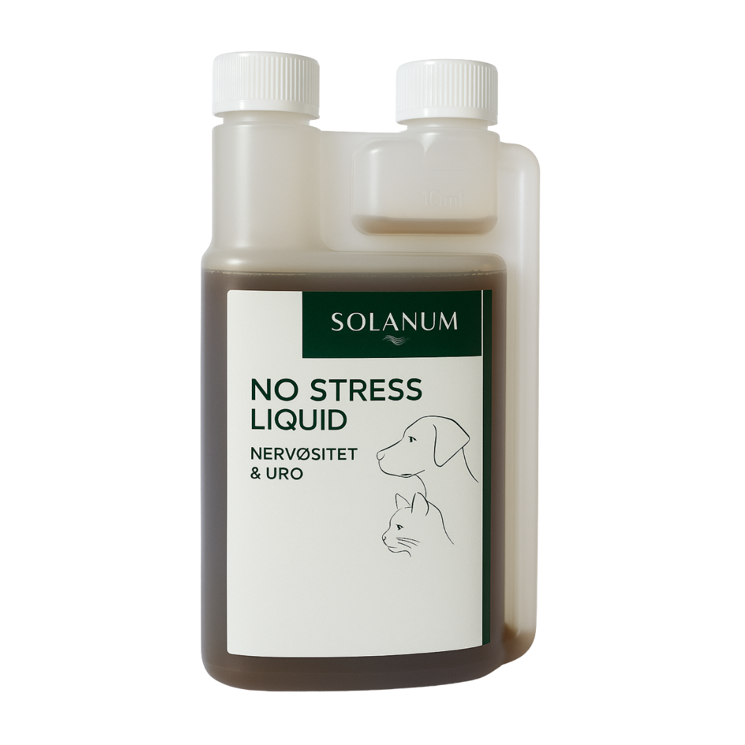 Solanum No Stress, Liquid er specielt udviklet til hunde og katte, og er mere skånsom for hunden, end Solanum No Stress (pulverform).
